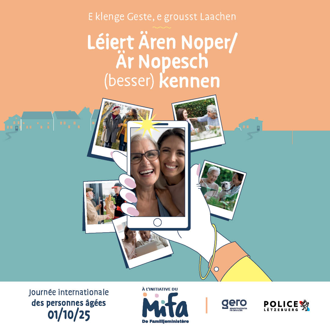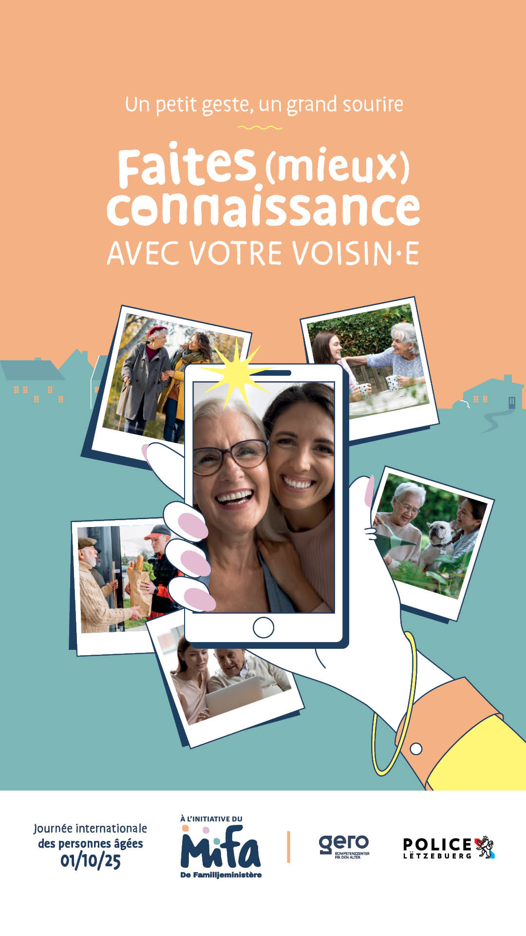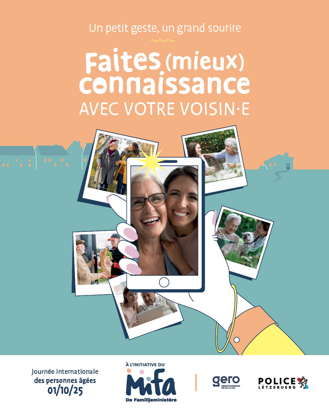 À l’occasion de la Journée Internationale des personnes âgées, le ministère de la Famille, des Solidarités, du Vivre-Ensemble et de l’Accueil, la Police et GERO lancent une campagne pour créer ou renforcer les liens de voisinage, en particulier avec les personnes plus âgées.